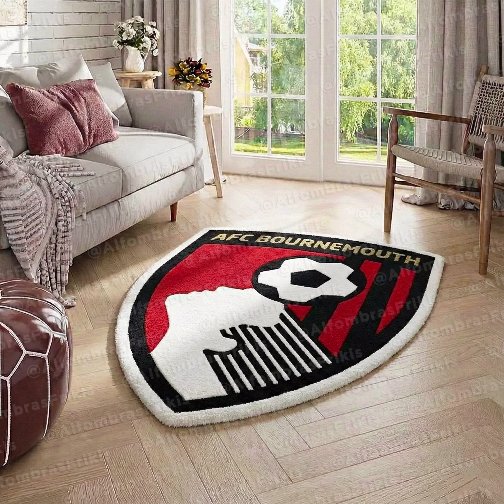 Alfombra artesanal del escudo del AFC Bournemouth. Ideal para aficionados de la Premiere League, esta pieza única aporta la pasión del fútbol y un diseño duradero a su espacio.