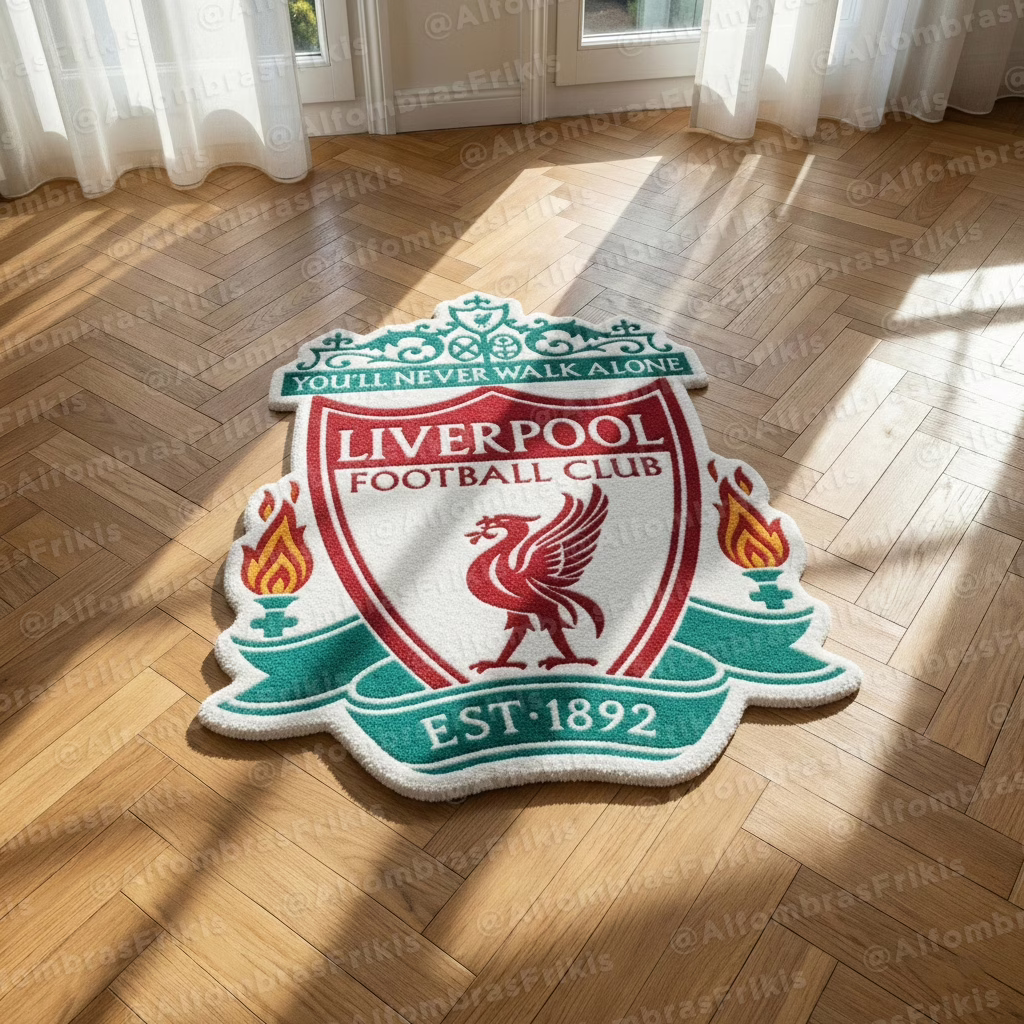 Alfombra de escudo del Liverpool FC, perfecta para amantes del fútbol y la Premiere League.