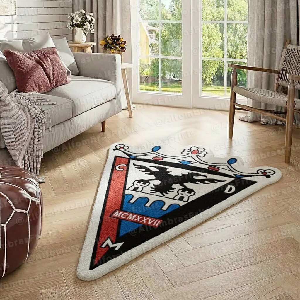 Eleve la decoración de su espacio con esta alfombra artesanal del escudo del Club Deportivo Mirandés, una pieza exclusiva diseñada para los verdaderos aficionados de La Liga Hypermotion. Este artículo combina una estética deportiva elegante con una manufactura de alta calidad, ideal para dormitorios, salones o zonas de juego.