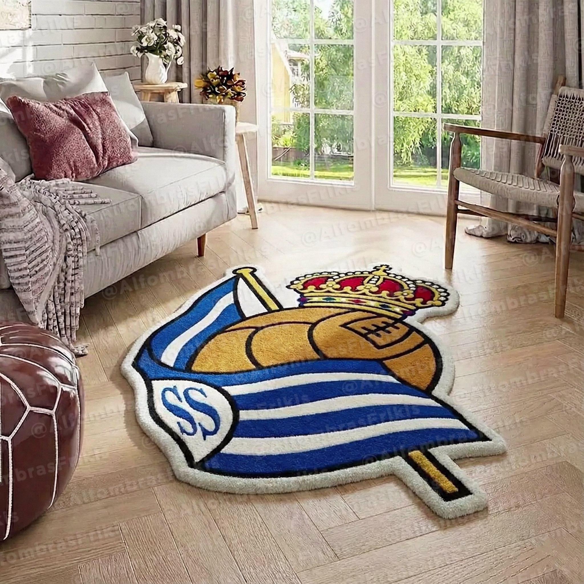 Alfombra oficial con el escudo de la Real Sociedad de Fútbol, ideal para el aficionado. Demuestre su pasión con un elemento decorativo de calidad superior.